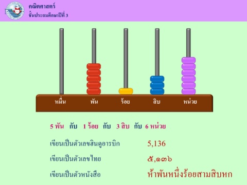 ์ คณิตศาสตร ี ึ ชนประถมศกษาปที่ 3 ั ้ หมน พัน รอย สบ หนวย ื่ ้ ่ ิ 5 พัน กับ 1 รอย กับ 3 สบ กับ 6 หนวย ้ ิ ่ ิ ิ ู ็ ี เขยนเปนตัวเลขฮนดอารบก 5,136 ็ เขยนเปนตัวเลขไทย ๕,๑๓๖ ี ึ ้ ิ ่ ็ ี ื เขยนเปนตัวหนังสอ ห้าพันหนงรอยสามสบหก