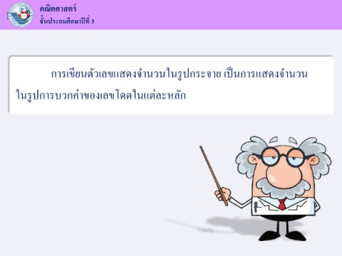 คณิตศาสตร ์ ั ี ึ ชนประถมศกษาปที่ 3 ้ ็ ู การเขยนตัวเลขแสดงจ านวนในรปกระจาย เปนการแสดงจ านวน ี ในรปการบวกค่าของเลขโดดในแต่ละหลัก ู