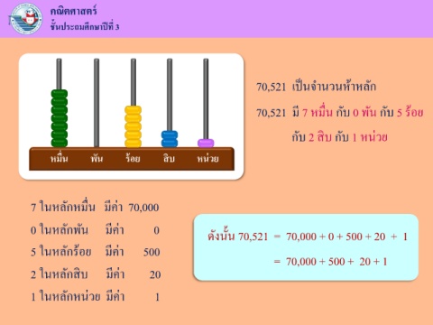 0 ในหลักพัน มค่า 0 ดังนั้น 70,521 = 70,000 + 0 + 500 + 20 + 1