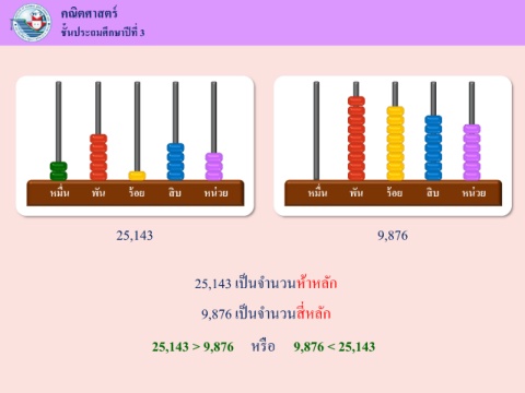 ์ คณิตศาสตร ั ึ ี ชนประถมศกษาปที่ 3 ้ ่ ิ ิ ้ ื่ ้ ื่ หมน พัน รอย สบ หนวย หมน พัน รอย สบ หนวย ่ 25,143 9,876 25,143 เปนจ านวนห้าหลัก ็ ี่ 9,876 เปนจ านวนสหลัก ็ ื 25,143 > 9,876 หรอ 9,876 < 25,143