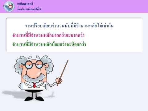 คณิตศาสตร ์ ั ึ ี ชนประถมศกษาปที่ 3 ้ ี ี ่ ี การเปรยบเทยบจ านวนนับทมจ านวนหลักไม่เท่ากัน ี จ านวนที่มีจ านวนหลักมากกวาจะมากกวา ่ ่ ่ ้ ้ ่ จ านวนที่มีจ านวนหลักนอยกวาจะนอยกวา
