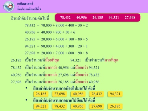 เรยงล าดับจ านวนต่อไปน้ ี 78,432 40,956 26,185 94,321 27,698
