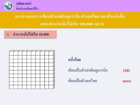 คณิตศาสตร ์ ้ ึ ั ี ชนประถมศกษาปที่ 3 ิ ื การอานและการเขียนตัวเลขฮนดูอารบิก ตัวเลขไทย และตัวหนงสอ ั ่ ั ่ แสดงจ านวนนบไมเกิน 100,000 และ 0 ่ ั o จ านวนนบไมเกิน 10,000 ึ่ ้ หนงรอย ิ ิ ู ี เขยนเปนตัวเลขฮนดอารบก 100 ็ ี เขยนเปนตัวเลขไทย ๑๐๐ ็