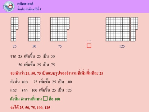 จะเหนวา 25, 50, 75 เปนแบบรูปของจ านวนทีเพิมขึ้นทีละ 25