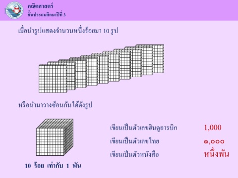 คณิตศาสตร ์ ั ชนประถมศกษาปที่ 3 ึ ้ ี ู ึ ้ ่ ื่ เมอน ารปแสดงจ านวนหนงรอยมา 10 รป ู หรอน ามาวางซ้อนกันได้ดังรป ู ื ี ิ ็ ู ิ เขยนเปนตัวเลขฮนดอารบก 1,000 ี ็ เขยนเปนตัวเลขไทย ๑,๐๐๐ ึ ่ ื ี ็ เขยนเปนตัวหนังสอ หนงพัน ้ ่ 10 รอย เทากับ 1 พัน