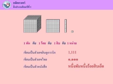 ์ คณิตศาสตร ึ ี ชนประถมศกษาปที่ 3 ้ ั ้ ่ ิ 1 พัน กับ 1 รอย กับ 1 สบ กับ 1 หนวย ิ ิ ู ็ ี เขยนเปนตัวเลขฮนดอารบก 1,111 เขยนเปนตัวเลขไทย ๑,๑๑๑ ี ็ ่ ่ ึ ิ ้ ึ เขยนเปนตัวหนังสอ หนงพันหนงรอยสบเอ็ด ี ื ็