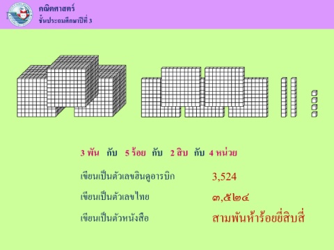 ์ คณิตศาสตร ึ ี ชนประถมศกษาปที่ 3 ้ ั ิ ้ 3 พัน กับ 5 รอย กับ 2 สบ กับ 4 หนวย ่ ็ ิ ู เขยนเปนตัวเลขฮนดอารบก 3,524 ี ิ ี เขยนเปนตัวเลขไทย ๓,๕๒๔ ็ ้ ิ ็ ื ี เขยนเปนตัวหนังสอ สามพันห้ารอยยี่สบส ี่