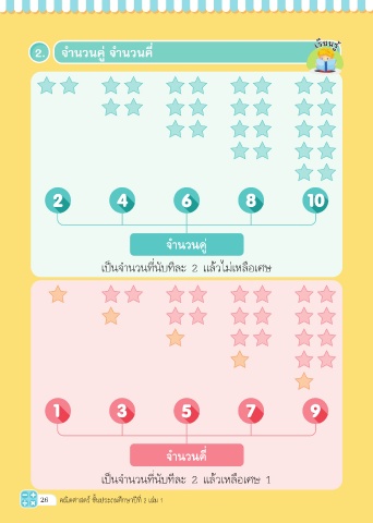 ี ี ู เรยนรู ้ ้ 2. จานวนคู่ จานวนคี่ เรยนร ำ ำ จำานวนคู่ เป็นจำ�นวนที่นับทีละ 2 แล้วไม่เหลือเศษ จำานวนคี่ เป็นจำ�นวนที่นับทีละ 2 แล้วเหลือเศษ 1 26 คณิตศาสตร์ ชั้นประถมศึกษาปีที่ 2 เล่ม 1