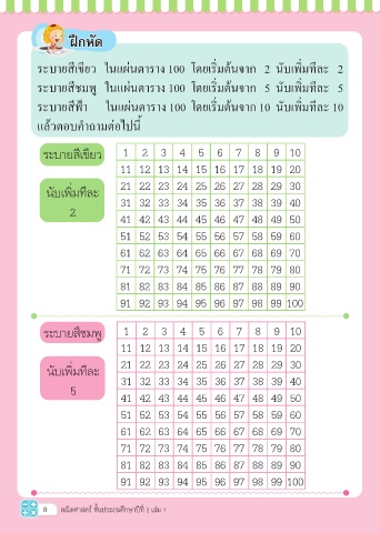 ระบายสีเขียว ในแผ่นตาราง 100 โดยเริ่มต้นจาก 2 นับเพิ่มทีละ 2