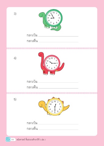 3) 11 12 1 10 2 9 3 8 4 7 5 6 กลางวัน กลางคืน 4) 11 12 1 10 2 9 3 8 4 7 5 6 กลางวัน กลางคืน 5) 11 12 1 10 2 9 3 8 4 7 6 5 กลางวัน กลางคืน 14 คณิตศาสตร์ ชั้นประถมศึกษาปีที่ 2 เล่ม 2