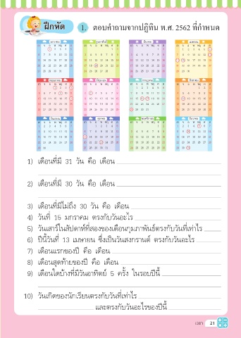 ฝึกหัด 1. ตอบคำาถามจากปฏิทิน พ.ศ. 2562 ที่กำาหนด