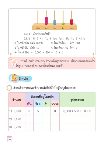 6,314 มี 6 พัน กับ 3 ร้อย กับ 1 สิบ กับ 4 หน่วย