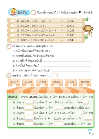 ตัวอย่าง จำานวน 64,901 มีเลขโดด 4 มีค่า 4,000 และเลขโดด 9 มีค่า 900
