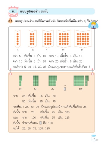 จะเห็นว่า 5, 10, 15, 20, 25 เป็นแบบรูปของจำานวนที่เพิ่มขึ้นทีละ 5