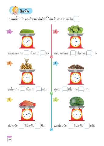 ฝึกหัด ฝึกหัด บอกน้าหนักของสิ่งของต่อไปนี้ โดยเติมคำาตอบลงใน ำ 1. 2. มะละกอหนัก กิโลกรัม ขีด น้อยหน่าหนัก กิโลกรัม กรัม 3. 4. ลำาไยหนัก กิโลกรัม กรัม ปูหนัก กิโลกรัม กรัม 5. 6. ปลาหนัก กิโลกรัม ขีด แตงโมหนัก กิโลกรัม กรัม 20