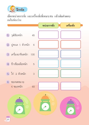 ฝึกหัด ฝึกหัด เลือกหน่วยการชั่ง และเครื่องชั่งที่เหมาะสม แล้วเติมคำาตอบ ลงในช่องว่าง หน่วยการชั่ง เครื่องชั่ง 1. วุฒิชัยหนัก 45 2. ปูทะเล 1 ตัวหนัก 6 3. เครื่องยาจีนหนัก 100 4. ข้าวซ้อมมือหนัก 5 5. ไก่ 2 ตัวหนัก 3 6. ซองจดหมาย 4 ซองหนัก 60 22