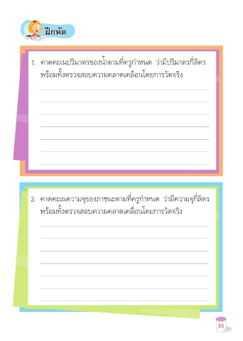 ฝึกหัด ฝึกหัด 1. คาดคะเนปริมาตรของน้าตามที่ครูกำาหนด ว่ามีปริมาตรกี่ลิตร ำ พร้อมทั้งตรวจสอบความคลาดเคลื่อนโดยการวัดจริง 2. คาดคะเนความจุของภาชนะตามที่ครูกำาหนด ว่ามีความจุกี่ลิตร พร้อมทั้งตรวจสอบความคลาดเคลื่อนโดยการวัดจริง 35
