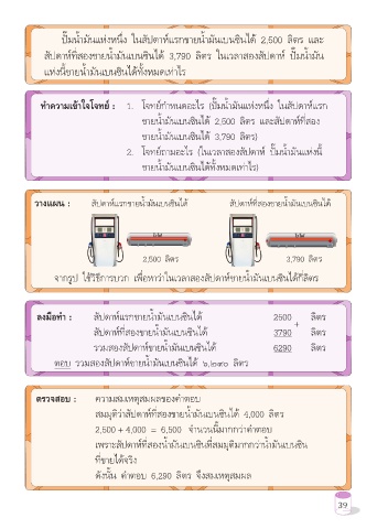 จากรูป ใช้วิธีการบวก เพื่อหาว่าในเวลาสองสัปดาห์ขายน้ามันเบนซินได้กี่ลิตร