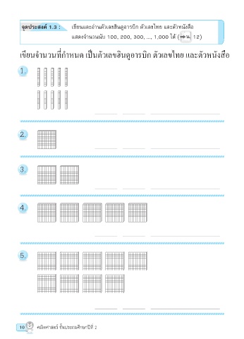 จุดประสงค์ 1.3 : เขียนและอ่านตัวเลขฮินดูอารบิก ตัวเลขไทย และตัวหนังสือ แสดงจำานวนนับ 100, 200, 300, ..., 1,000 ได้ ( น. 12) เขียนจำานวนที่กำาหนด เป็นตัวเลขฮินดูอารบิก ตัวเลขไทย และตัวหนังสือ 1. 2. 3. 4. 5. 10 คณิตศาสตร์ ชั้นประถมศึกษาปีที่ 2