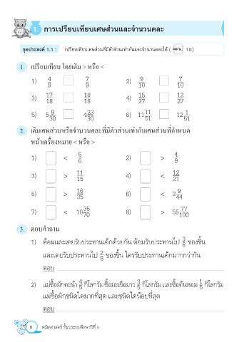 จุดประสงค์ 1.1 : เปรียบเทียบเศษส่วนที่มีตัวส่วนเท่ากันและจำานวนคละได้ ( น. 10)