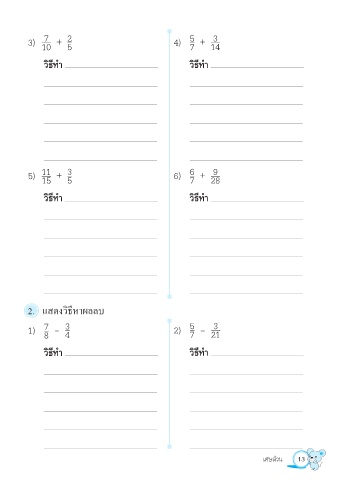 3 7 3) 10 + 2 4) 5 + 14 5 7 วิธีทำ� วิธีทำ� 9 5) 11 + 3 6) 6 + 28 5 15 7 วิธีทำ� วิธีทำ� 2. แสดงวิธีห�ผลลบ 3 1) 7 - 3 2) 5 - 21 4 7 8 วิธีทำ� วิธีทำ� เศษส่วน 13