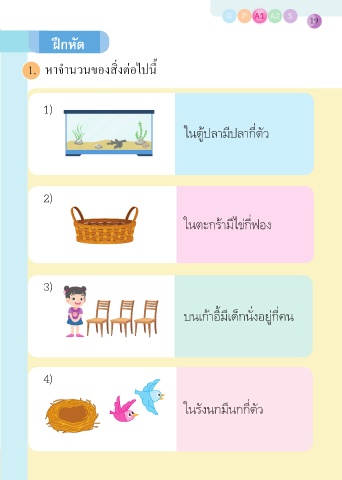 G P A1 A2 S 19 A1 ฝึกหัด 1. หาจำานวนของสิ่งต่อไปนี้ 1) ในตู้ปล�มีปล�กี่ตัว 2) ในตะกร้�มีไข่กี่ฟอง 3) บนเก้�อี้มีเด็กนั่งอยู่กี่คน 4) ในรังนกมีนกกี่ตัว