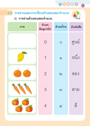 G G P A1 A2 S 21 2.3 ก�รอ่�นและก�รเขียนตัวเลขแสดงจำ�นวน 1) การอ่านตัวเลขแสดงจำานวน ตัวเลข ภาพ ตัวเลขไทย ตัวหนังสือ ฮินดูอารบิก 0 ๐ ศูนย์ 1 ๑ หนึ่ง 2 ๒ สอง 3 ๓ ส�ม 4 ๔ สี่