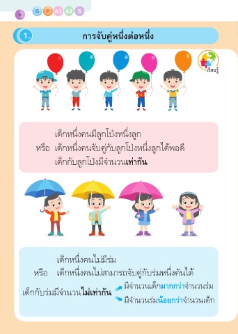 เด็กกับร่มมีจำ�นวนไม่เท่ากัน ➠มีจำ�นวนเด็กมากกว่าจำ�นวนร่ม