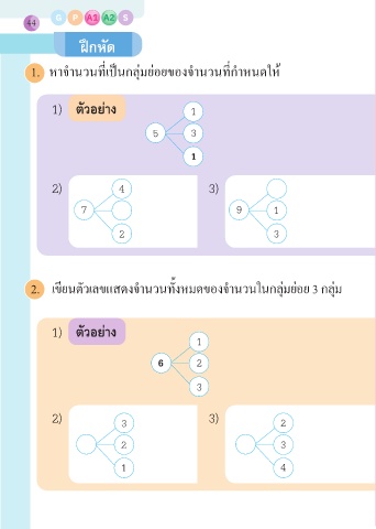 A1 A2 44 G P A1 A2 S ฝึกหัด 1. หาจำานวนที่เป็นกลุ่มย่อยของจำานวนที่กำาหนดให้ 1) ตัวอย่าง 1 5 3 1 2) 3) 4 7 9 1 2 3 2. เขียนตัวเลขแสดงจำานวนทั้งหมดของจำานวนในกลุ่มย่อย 3 กลุ่ม 1) ตัวอย่าง 1 6 2 3 2) 3) 2 3 2 3 1 4