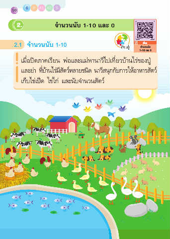 10 G G P A1 A2 S 2. 2. จำานวนนับ 1-10 และ 0 2.1 จำ�นวนนับ 1-10 จำ�นวนนับ เรื่อง 1-10 และ 0 ่ เมื่อปิดภ�คเรียน พ่อและแม่พ�น�วีไปเที่ยวบ้�นไร่ของปู ์ ่ และย� ท่บ�นไร่มีสัตว์หล�ยชนิด น�วีสนุกกับก�รให้อ�ห�รสัตว ้ ี เก็บไข่เป็ด ไข่ไก่ และนับจำ�นวนสัตว์