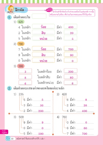 นักเรียนทำาฝึกหัดเก่ยวกับค่าของเลขโดดในแต่ละหลัก จากน้น