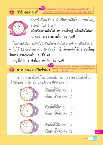 1.2 ชั่วโมงและนาที หน้าชั้นเรียน แล้วร่วมกันอ่านเวลาเป็นชั่วโมง ตั้งแต่ 1 นาฬิกา ถึง 24 นาฬิกา