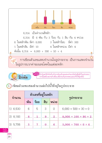 6,314 มี 6 พัน กับ 3 ร้อย กับ 1 สิบ กับ 4 หน่วย