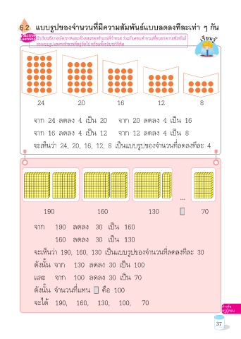 จะเห็นว่า 190, 160, 130 เป็นแบบรูปของจำานวนที่ลดลงทีละ 30