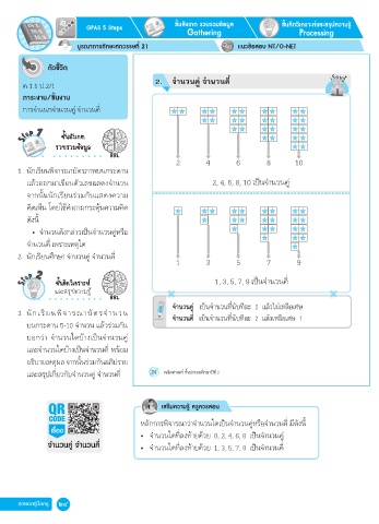 3. นักเรียนพิจารณาบัตรจานวน จำ�นวนคี่ เป็นจำ�นวนที่นับทีละ 2 แล้วเหลือเศษ 1
