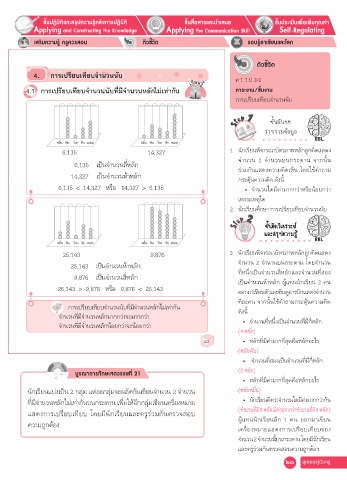 ที่มีจ�านวนหลักไม่เท่ากันบนกระดาน เพื่อให้อีกกลุ่มเขียนเครื่องหมาย • นักเรียนคิดว่าจ�านวนใดมีค่ามากกว่ากัน