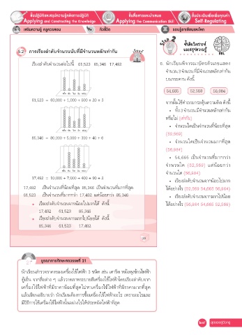 61,523 = 60,000 + 1,000 + 500 + 20 + 3 จากนั้นใช้ค�าถามกระตุ้นความคิด ดังนี้