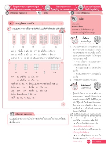จะเห็นว่า 5, 10, 15, 20, 25 เป็นแบบรูปของจำานวนที่เพิ่มขึ้นทีละ 5 กระตุ้นความคิด ดังนี้