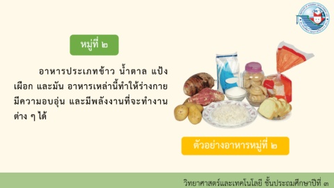 หมู่ที่ ๒ อาหารประเภทข้าว น าตาล แป้ง เผือก และมัน อาหารเหล่านี ท าให้ร่างกาย มีความอบอุ่น และมีพลังงานที่จะท างาน ต่าง ๆ ได้ ตัวอย่างอาหารหมู่ที่ ๒ วิทยาศาสตร์และเทคโนโลยี ชั้นประถมศึกษาปีที่ ๓
