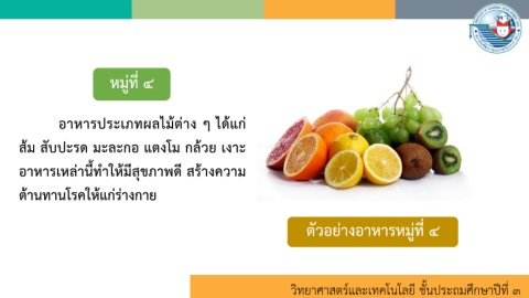 หมู่ที่ ๔ อาหารประเภทผลไม้ต่าง ๆ ได้แก่ ส้ม สับปะรด มะละกอ แตงโม กล้วย เงาะ อาหารเหล่านี ท าให้มีสุขภาพดี สร้างความ ต้านทานโรคให้แก่ร่างกาย ตัวอย่างอาหารหมู่ที่ ๔ วิทยาศาสตร์และเทคโนโลยี ชั้นประถมศึกษาปีที่ ๓