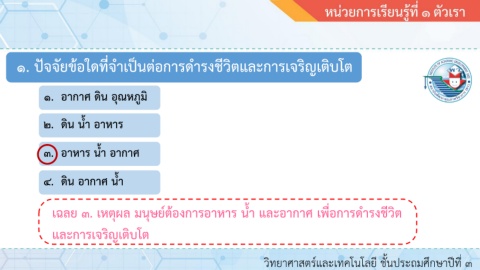 เฉลย ๓. เหตุผล มนุษย์ต้องการอาหาร น า และอากาศ เพื่อการด ารงชีวิต