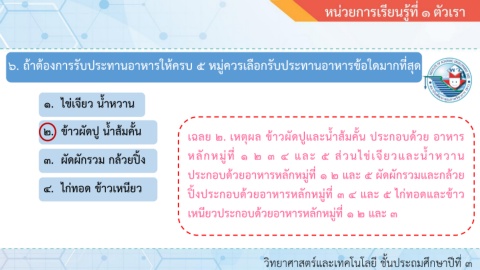 ๒. ข้าวผัดปู น าส้มคั น เฉลย ๒. เหตุผล ข้าวผัดปูและน าส้มคั น ประกอบด้วย อาหาร