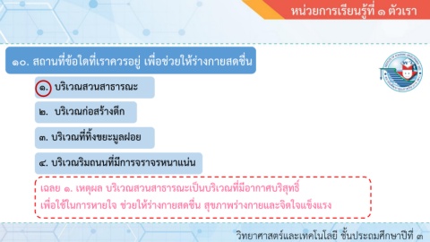 ๑๐. สถานที่ข้อใดที่เราควรอยู่ เพื่อช่วยให้ร่างกายสดชื่น