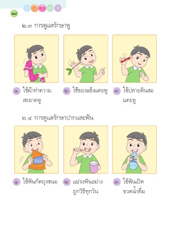 G P A1 P A1 A2 S 38 ๒.๓ การดูแลรักษาหู ๑ ใช้ผ้าทำาความ ๒ ใช้ของแข็งแคะหู ๓ ใช้ปลายดินสอ สะอาดหู แคะหู ๒.๔ การดูแลรักษาปากและฟัน ขนม ๑ ใช้ฟันกัดถุงขนม ๒ แปรงฟันอย่าง ๓ ใช้ฟันเปิด ำ ถูกวิธีทุกวัน ขวดน้าดื่ม