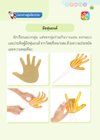 G P A1 A2 S 41 โครงงานสู่นวัตกรรม มือหุ่นยนต์ นักเรียนแบ่งกลุ่ม แต่ละกลุ่มร่วมกันวางแผน ออกแบบ ี และประดิษฐ์มือห่นยนต์ จากวัสดุท่เหมาะสม ด้วยความประหยัด ุ และความพอเพียง