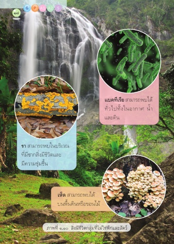 G G P A1 A2 S P 18 แบคทีเรีย สามารถพบได้ ทั่วไปทั้งในอากาศ นํ้า และดิน รา สามารถพบในบริเวณ ที่มีซากสิ่งมีชีวิตและ มีความชุ่มชื้น เห็ด สามารถพบได้ บนพื้นดินหรือขอนไม้ ภาพที่ ๑.๑๐ สิ่งมีชีวิตกลุ่มที่ไม่ใช่พืชและสัตว์