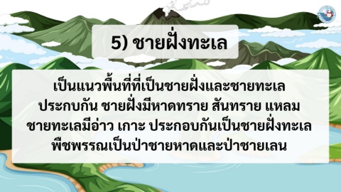 5) ชายฝังทะเล ่ ้ ็ ่ ่ ็ เปนแนวพืนทีทีเปนชายฝั ่ งและชายทะเล ั ประกบกน ชายฝั ่ งมีหาดทราย สันทราย แหลม ็ ่ ั ชายทะเลมีอาว เกาะ ประกอบกนเปนชายฝั ่ งทะเล พืชพรรณเป็นป่าชายหาดและป่าชายเลน