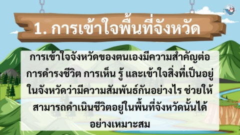 1. การเข้าใจพืนที่จงหวด ั ้ ั ั ่ ั การเข้าใจจงหวดของตนเองมีความส าคญตอ ั ู ็ ่ ้ ิ การดารงชีวต การเห็น ร้ และเขาใจสิ่งทีเปนอย่ ู ่ ั ั ในจงหวดวามีความสัมพันธกนอย่างไร ช่วยให้ ั ์ ิ ู ั ิ สามารถดาเนนชีวตอย่ในพืนทีจงหวดน้นได ้ ่ ้ ั ั อย่างเหมาะสม