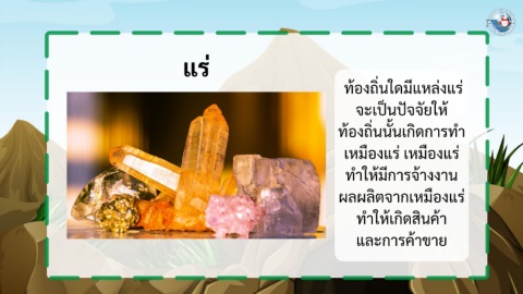 แร่ ่ ้ ทองถ่นใดมีแหลงแร่ ิ ั จะเป็นปัจจยให้ ิ ิ ทองถ่นนั้นเกดการทา ้ เหมืองแร่ เหมืองแร่ ้ ทาให้มีการจางงาน ิ ผลผลตจากเหมืองแร่ ้ ทาให้เกดสินคา ิ ้ และการคาขาย