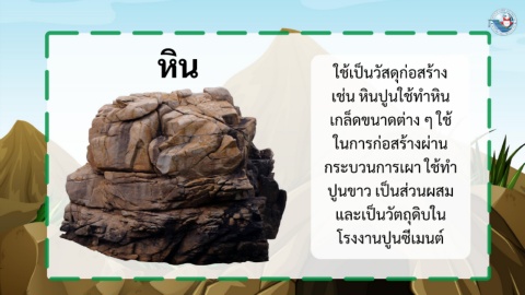 หิน ใช้เป็นวสดุกอสร้าง ั ่ ู เช่น หินปนใช้ทาหิน ็ ่ เกลดขนาดตาง ๆ ใช้ ่ ในการกอสร้างผ่าน กระบวนการเผา ใช้ทา ปนขาว เป็นส่วนผสม ู ิ และเป็นวตถุดบใน ั โรงงานปนซีเมนต ์ ู